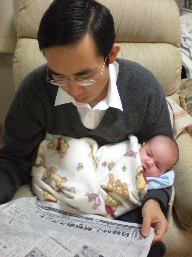 Dad arrived safely here and has been thoroughly charmed by Tomoki! Dad has been a great help too--he changed diapers, washed dishes, rocked Tomoki, and even did a little packing for me! He and Akihiro left Monday for the Phillippines. Akihiro's mom is staying with me while he is gone. Tomoki continues to change every day and is charming us all. He had a busy last two weekends with lots of time in the car and lots of time being held by his many admirers, but it seems that he is a social butterfly and rises to each occasion valiantly! Here's a few pics...