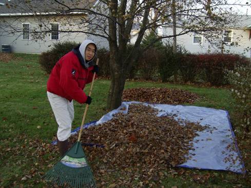 Akihiro had never raked leaves before! We had plenty of leaves in the backyard for him to experiment with!